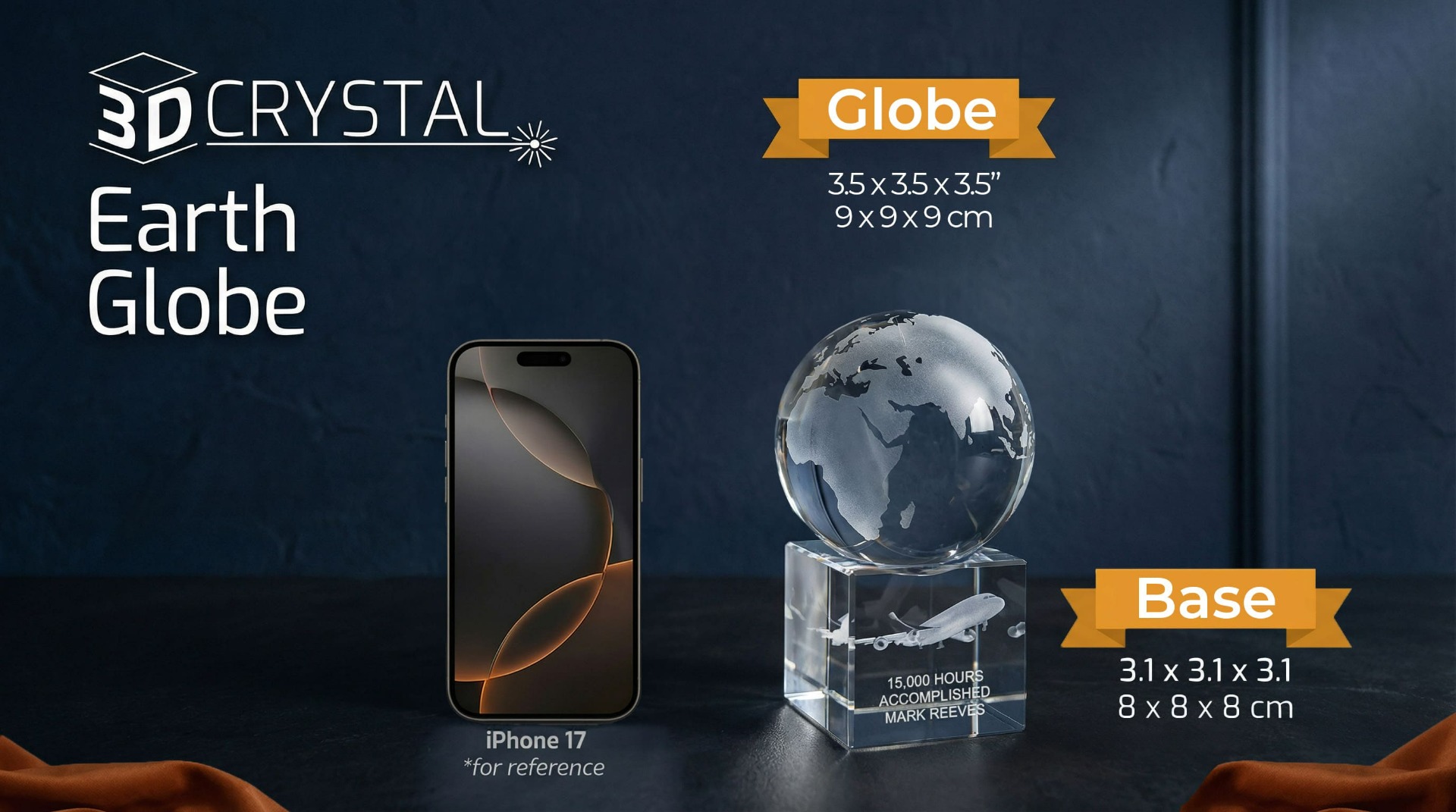 Our 3D Crystal earth globe is brilliant as a custom award desk piece. The top is the surface etched map of earth. The customized bottom includes custom logos, text, and 3D Images of your brand or product. A great recognition piece for recipients whose reputation is world wide.